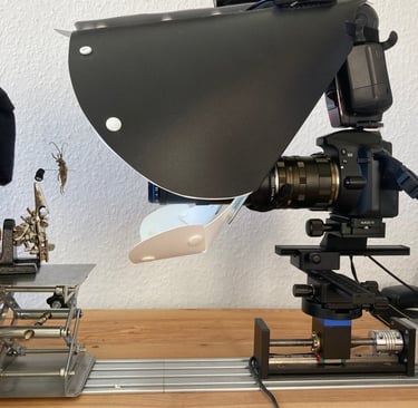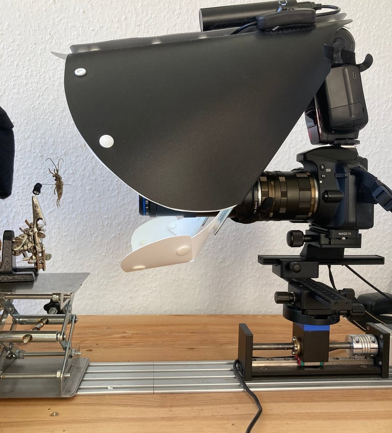 Die meisten meiner Bilder entstehen mit einer Technik namens Focus Stacking. In diesem extremen Nahbereich ist die Tiefenschärfe selbst bei geschlossener Blende nur wenige Zehntelmillimeter groß. Würde man nur ein einzelnes Foto aufnehmen, wäre immer nur ein winziger Teil des Insekts scharf – der Rest verschwimmt.